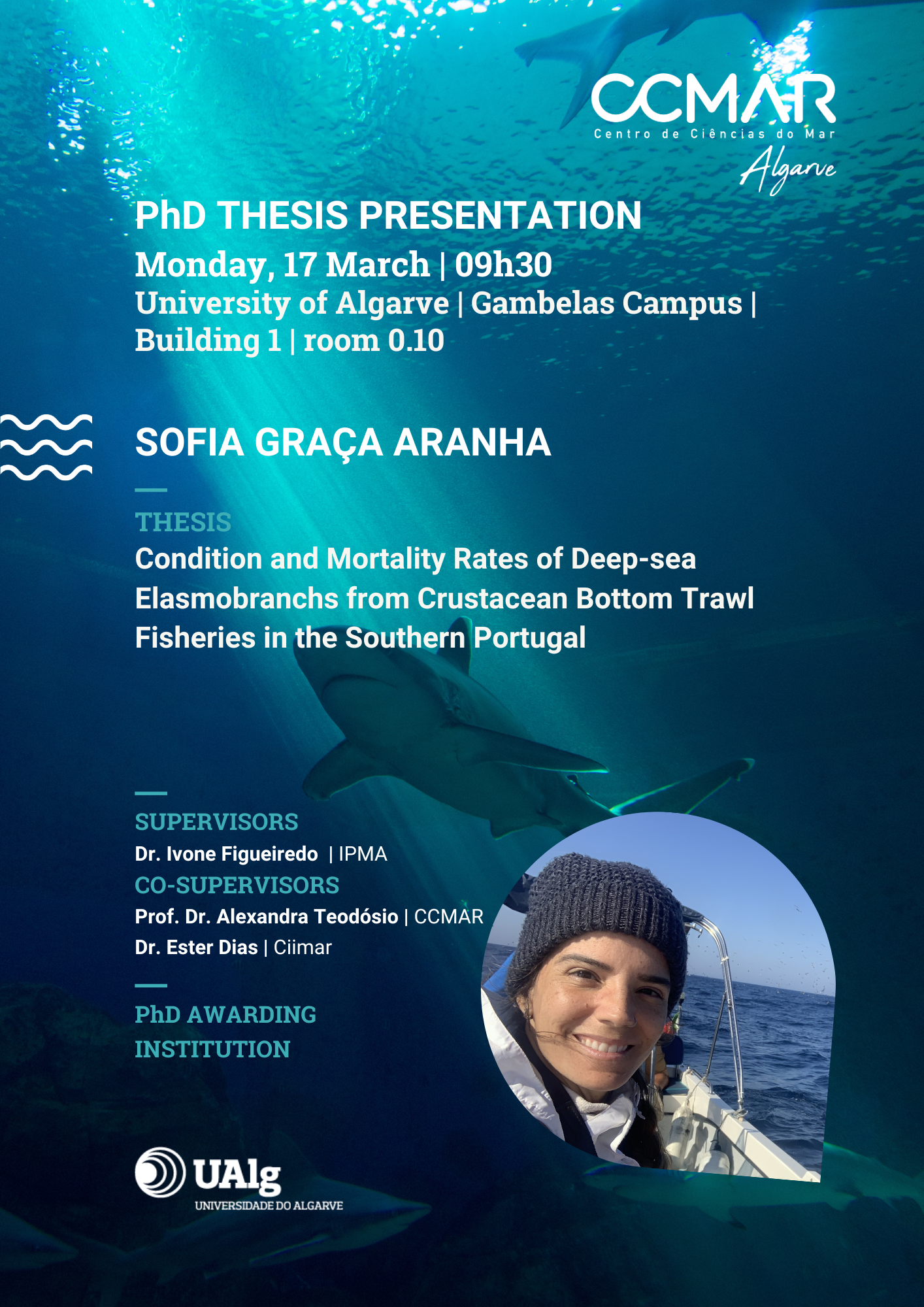 Currently, as a PhD candidate from the University of Algarve and as a research assistant at CCMAR, she is continuing with the work developed for her master's degree, thus, expanding the focus to deep-sea elasmobranchs and their interactions with crustacean bottom trawlers, as part of two research and technological projects: the DELASMOP (Deep-sea elasmobranchs of Portugal) and the EMREP (The development of electronic monitoring and reporting tools for the Portuguese fishery).